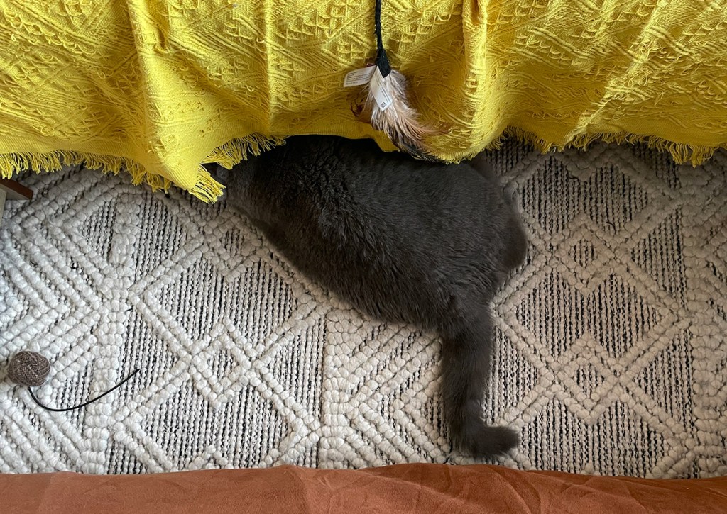 So far, Charlie hasn’t shown much interest in destroying the new couch, maybe because he has too much fun hiding underneath it. My old couch didn’t have legs, so now he has a brand new safe space: