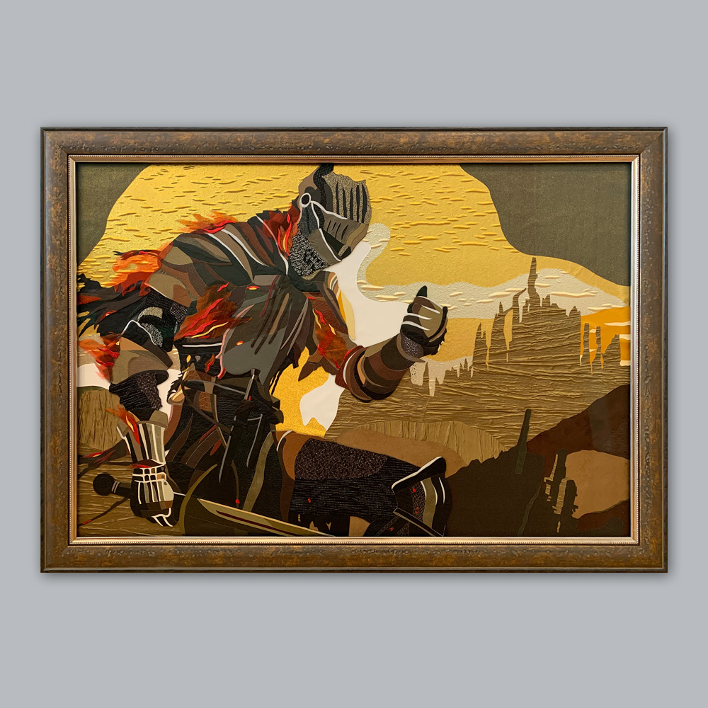Another request from my brother, based on Dark Souls III video game. While I miss doing artworks just for myself, I do like a challenge of imagery that I probably would never have chosen. I won’t lie, I would have loved to keep this one for myself. I really enjoyed working with leather and creating fire with the help of layered transparent fabrics. The air bubbles effect on the golden background was a pure fluke that would have ruined a different artwork, but worked perfectly here.