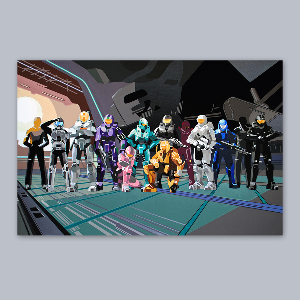 This artwork kicked off a series of orders from my family, starting with a request from my brother to make him one based on Red vs. Blue web TV series. It’s the most complicated and detailed artwork I’ve done yet, taking me a couple of years to complete.