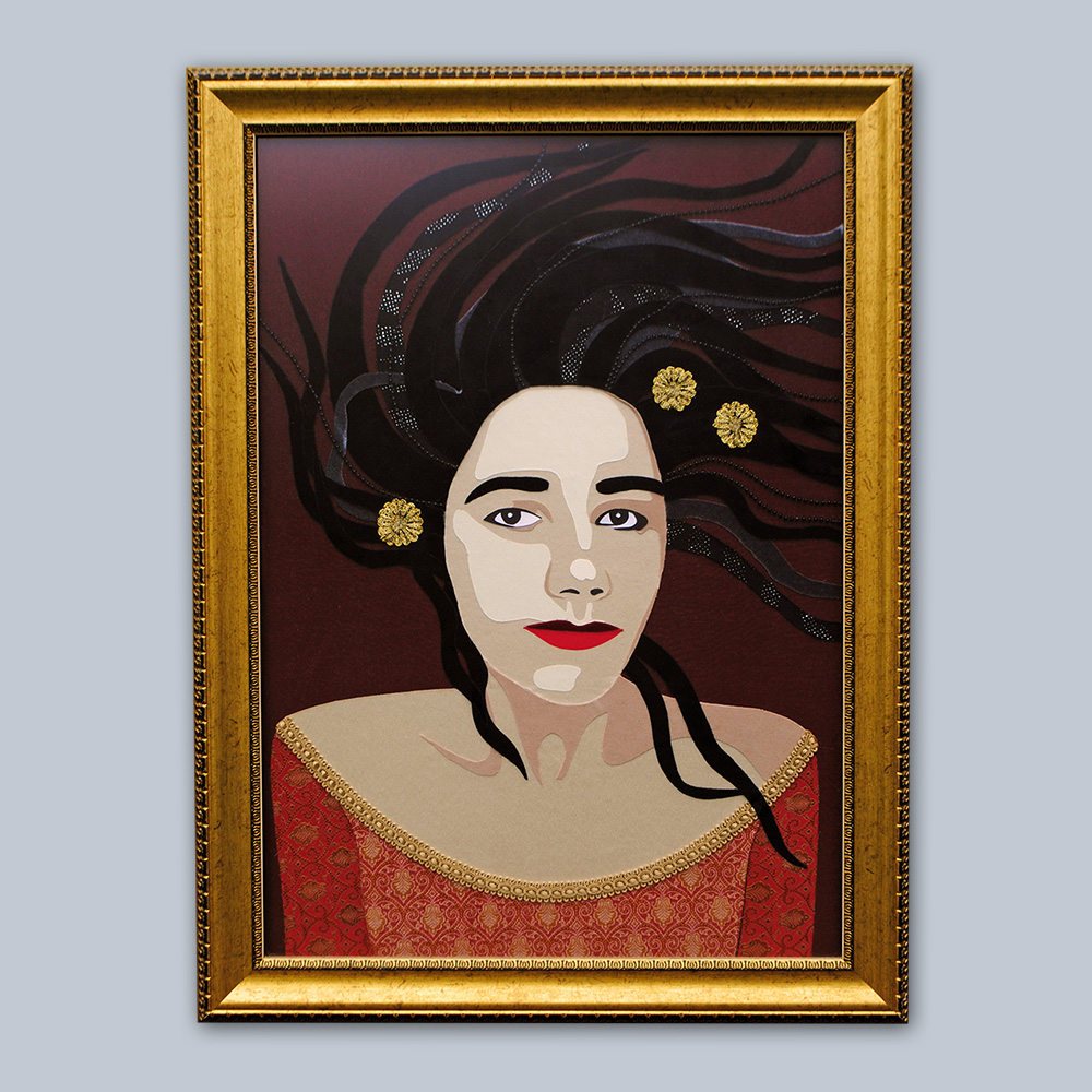 For the last few years, I’ve been doing artwork which I’m still not sure how to describe – appliqué or collage would be closest. They’re mostly fabric-based but along the way I’ve experimented with other materials like feathers, buttons, leather and jewelry. I get my inspirations from different sources but I’m often drawn to mythical and fairytale themes.