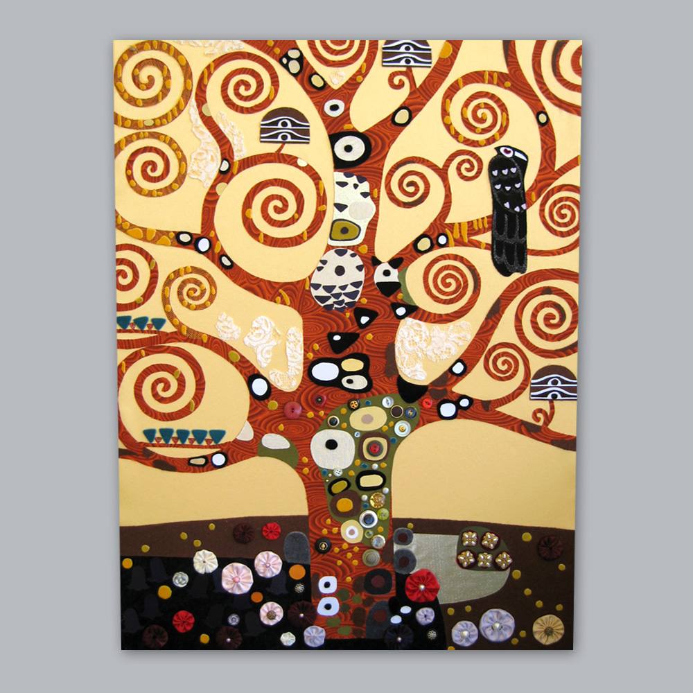 I love the art of Gustav Klimt and I based my second artwork on his famous Tree of Life. I had a lot of fun playing with the decorative elements, like the flowers I made from fabric and the buttons.