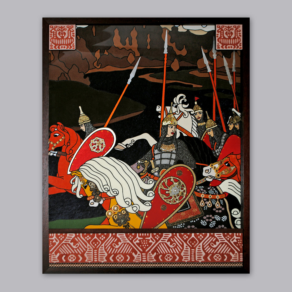 Ivan Bilibin was a Russian illustrator from the first half of the 20th century who, among other things, did wonderful and distinctive illustrations heavily influenced by the traditional Russian folklore. I based my fifth piece on one of his works, which I followed quite faithfully, except changing the main rider from male to female, just because. The two patterned squares and the stripe at the bottom actually go over the glass. Also, the spear points are metal and were kindly made for me by a friend.