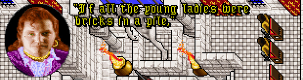 After the unsuccessful assassination attempt by one of Batlin’s men, I got an audience with Lady Yelinda… because she was moved by Iolo’s sappy song and not because we freed the Fawn Tower and saved the city from the Goblin stewpots. That’s some weird sense of priorities, but I guess it figures in a city that prizes Beauty first and most. Iolo receives White Diamond Necklace, which I think he never actually ends up giving to Gwenno. Then during the toasting Dupre stupidly hails Lord British and shit hits the fan.