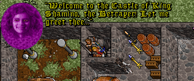 After the Hound sniffs Cantra’s wooden sword and points east, we came across a castle which Shamino recognised as his former home. Inside, we were greeted by the ghost of Beatrix, Shamino’s ex, who is mighty angry after all these centuries and stuffed the castle with booby traps, like the animated suits of armour and a bunch of undead.