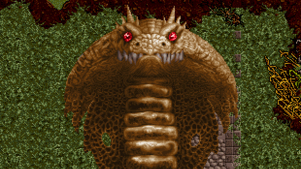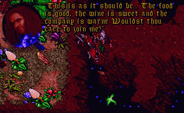 The swamp is pretty annoying to navigate and I hit a few dead ends before finally making it to the other side. I was prepared for it, but I still jumped when the Great Earth Serpent appeared with his portrait at 100% opacity. He’s basically Serpent Isle’s version of Time Lord, except that Time Lord was a lot more discreet about his appearances.