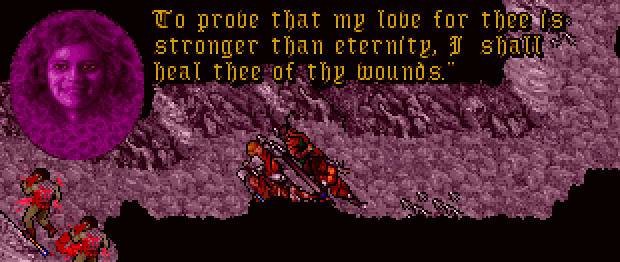 While travelling through the northern caves, Shamino died after stepping on caltrops one time too many, which prompted a visit from Beatrix, in a far more forgiving mood this time. She healed her ex-fiancee and gave him a book of angsty love sonnets.