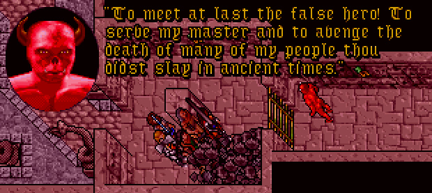 As to what the heck just happened, I always found it a bit confusing. As far as I understand, Guardian’s original plan was for Batlin to release the Banes imprisoned in the Order temples, and trigger the Imbalance that would eventually wipe out the Serpent Isle and Britannia with it. So far so clear. But then Batlin got power-hungry, and decided to somehow use the Banes in order to attain immortality and god-level powers… or something. Because the Bane cages weren’t constructed properly, the Banes escape and kill Batlin… so where does Guardian and his see how I reward those who fail meeee! fits in? Did he have something to do with freeing the Banes? Also, didn’t Batlin notice that his blackrock chaos serpent curves the wrong way and doesn’t fit into the slot inside the Shrine of Order?