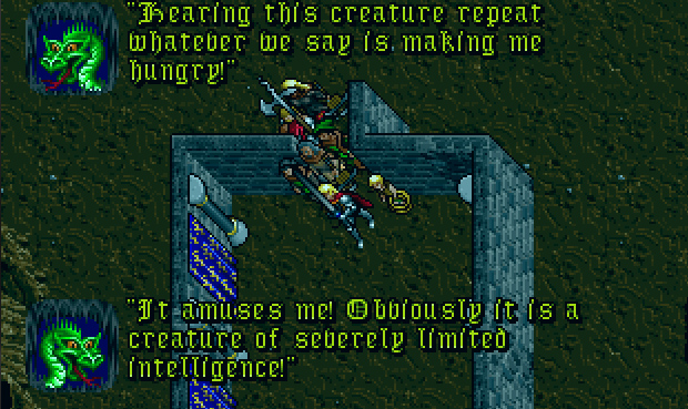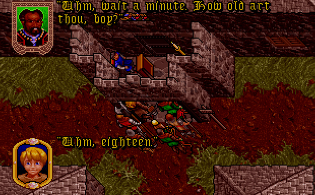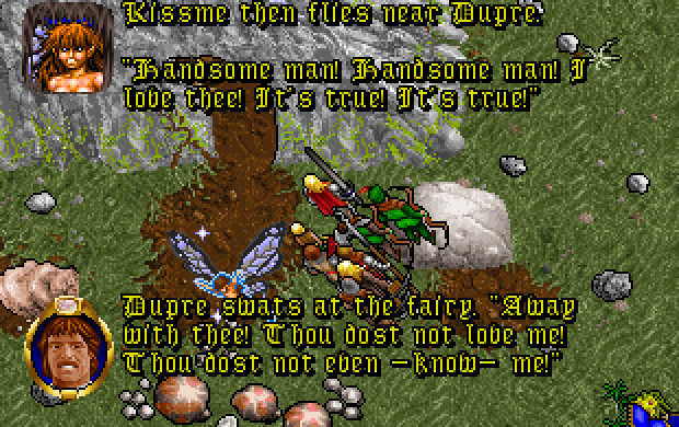 In Ambrosia, I met Kissme, a very excitable fairy whose job is to sprinkle love dust, speak exclusively with exclamation points, and constantly proclaim love for the first stranger she meets. She’s also quite naked, but I guess naked women aren’t a novelty to Spark by this point. Iolo, Shamino and Spark seemed to be quite taken with Kissme, but Dupre, the hard-headed realist, would have none of it.