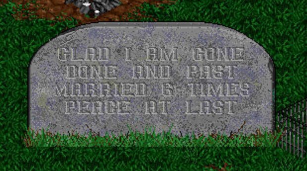 The Cemetery area has the most fabulous sepulchral score, and many amusing gravestones.