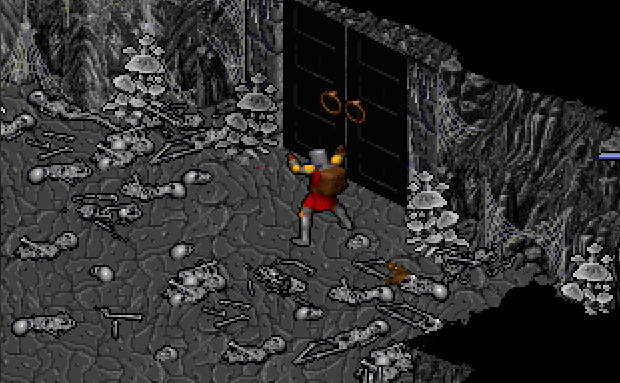 On the way to the Plateau, I visited a torax farm in the valley run by a married couple, where you learn that the valley might be haunted by a ghost. Then, inside the cave, oh joy it’s time for jumping on small stones across the water! Because I’m playing Ultima VIII Gold Edition for the first time, it took me a bit to figure out how jumping works since it’s different from the patched version. For a while, I achieved nothing but those dopey little headshakes Avatar does when you try to give him an impossible task.