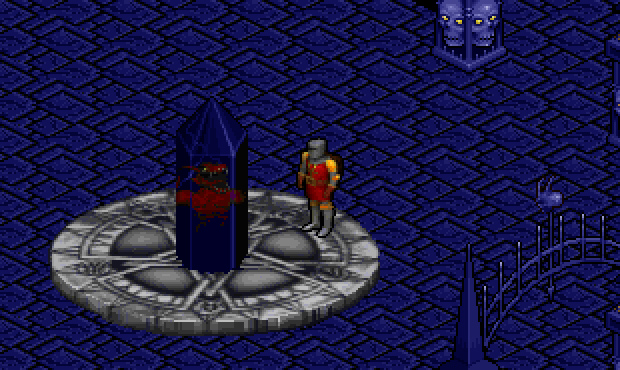 This is the end! Avatar undergoes yet another mysterious costume change, and walks very slowly across some weird silver plane, before facing the horrible reality: a land in ruins under a blood-red sky, with a giant stone visage of the Guardian towering over all and his mocking laughter ringing in your ears. Back when I first finished the game, I found this downer of an ending very powerful.