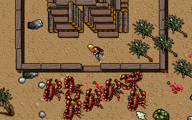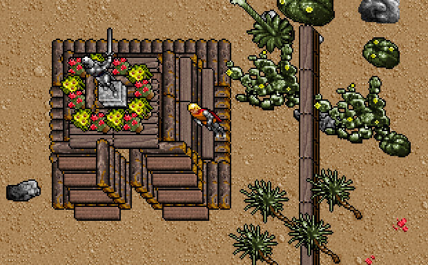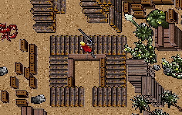 For the pyramid, I picked a spot in the desert north of Vesper, near an oasis, with some picturesque desert shrubbery around. Unfortunately, it also turned out to be infested with giant scorpions and snakes. Working in desert heat and getting bitten all over proved to be too much for the companions, who left for the Vesper pub.